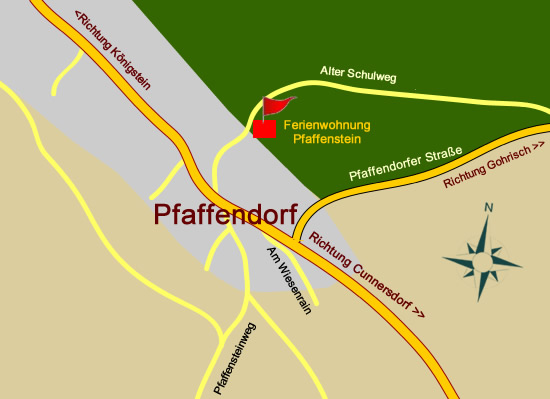 Anfahrt von Dresden auf der A17 bis Abfahrt Pirna und weiter in Richtung Pirna Zentrum. Sie kommen direkt auf die B172 und fahren weiter bis Königstein. In Königstein biegen Sie im Kreisverkehr die erste Abfahrt ab und fahren in Richtung Bielatal. Nach ca 300m biegen Sie links ab nach Pfaffendorf. Zum Alten Schulweg biegen Sie in Höhe des Parkplatzes links von der Hauptstraße ab und kommen auf der rechten Seite zu unserer Ferienwohnung. |